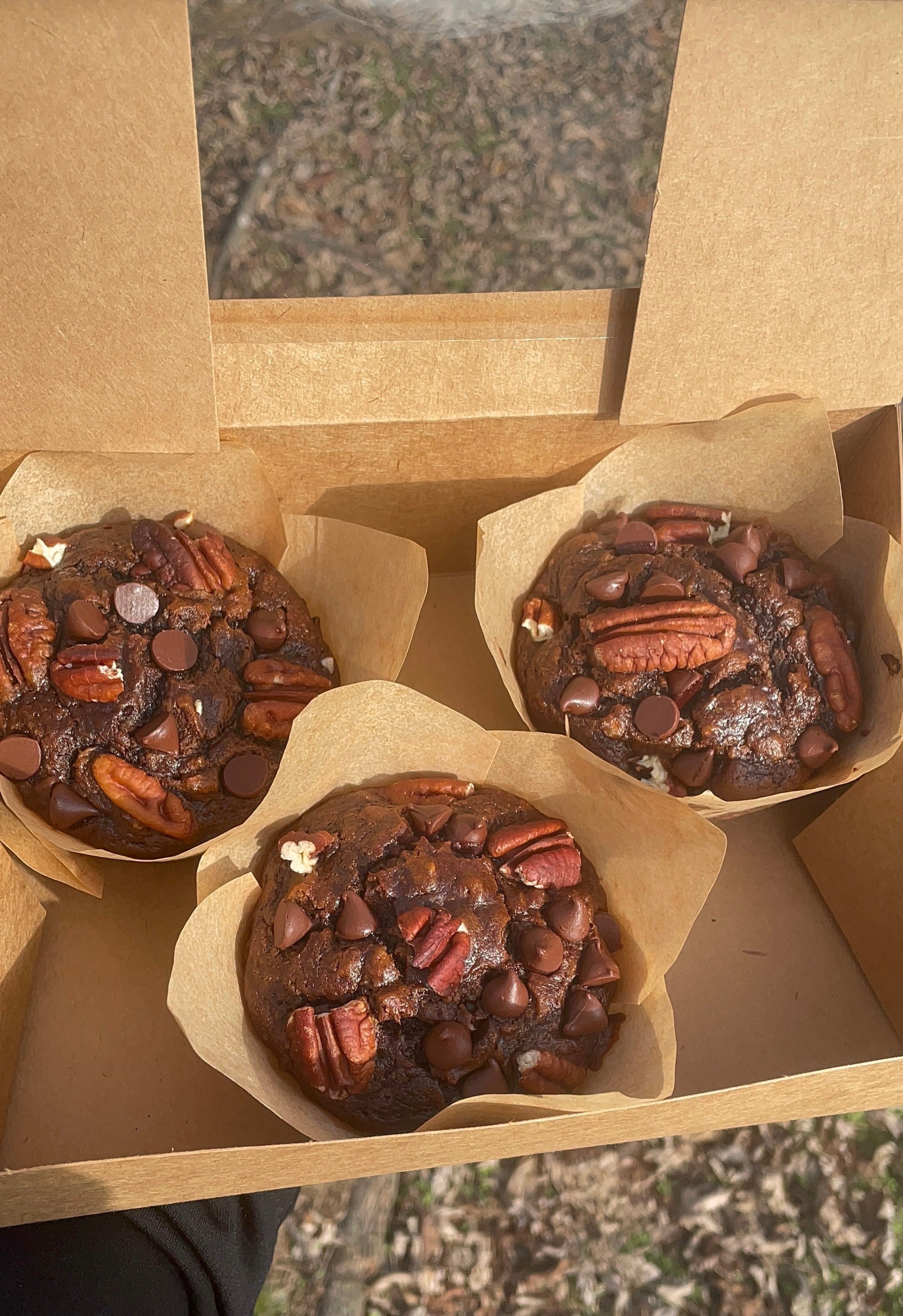 3 Organic and delicious Banana muffins with a wonderful coffee flavor! Of course we added in some pecans, chocolate chips, and gave you an optional coffee drizzle 😚🧡😍